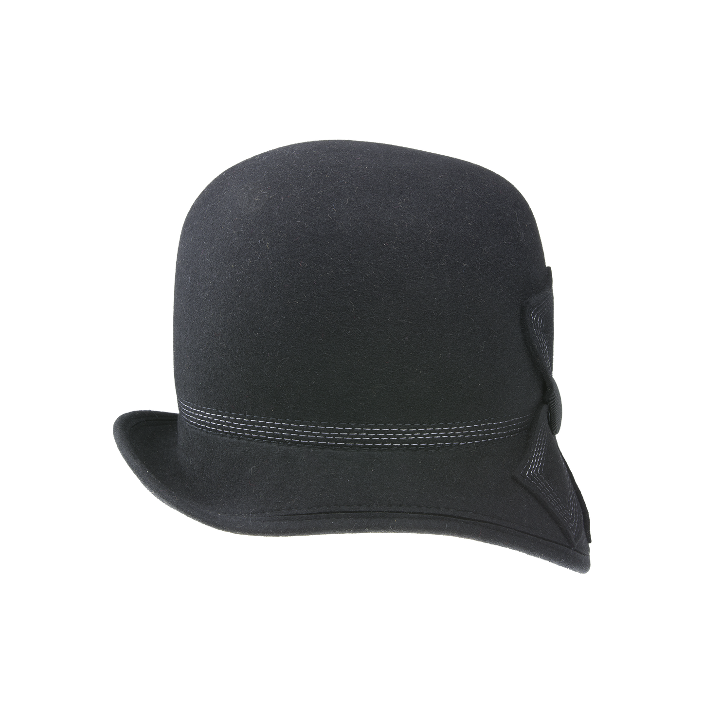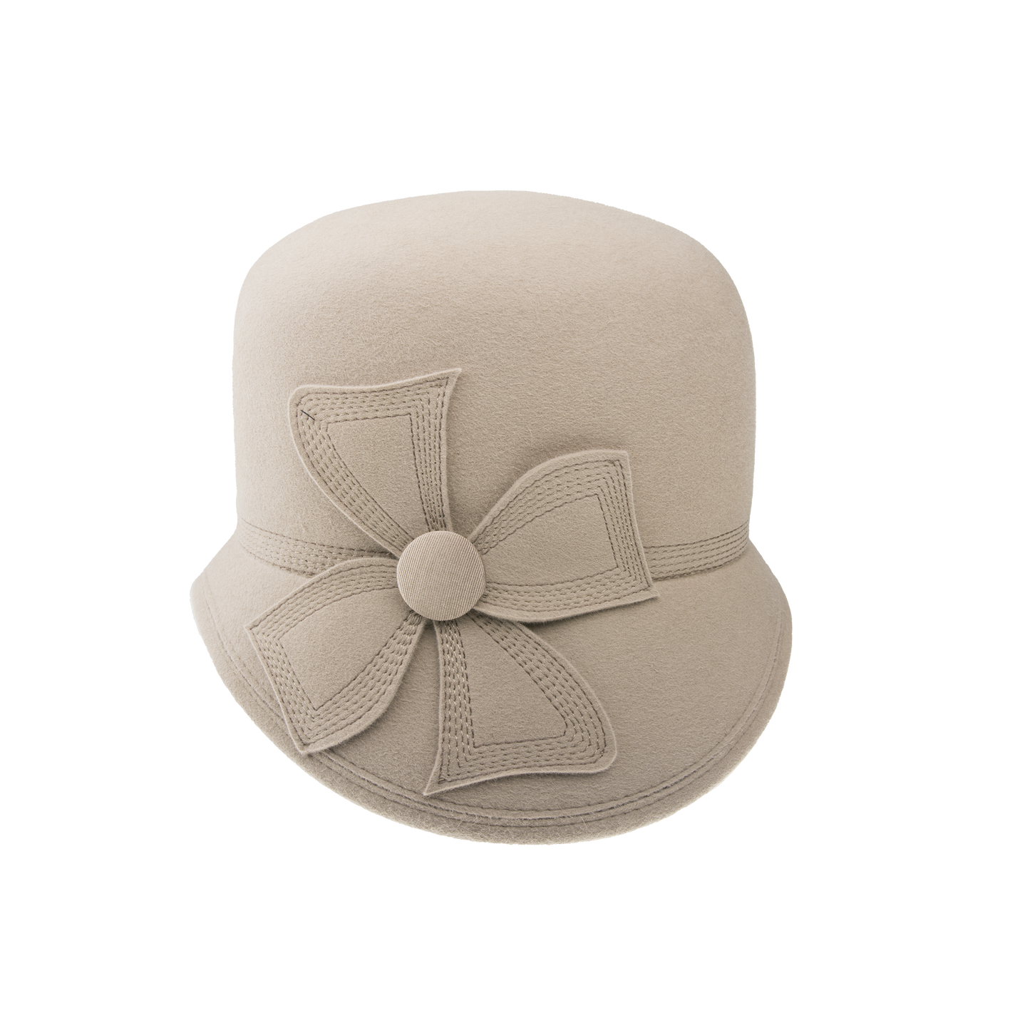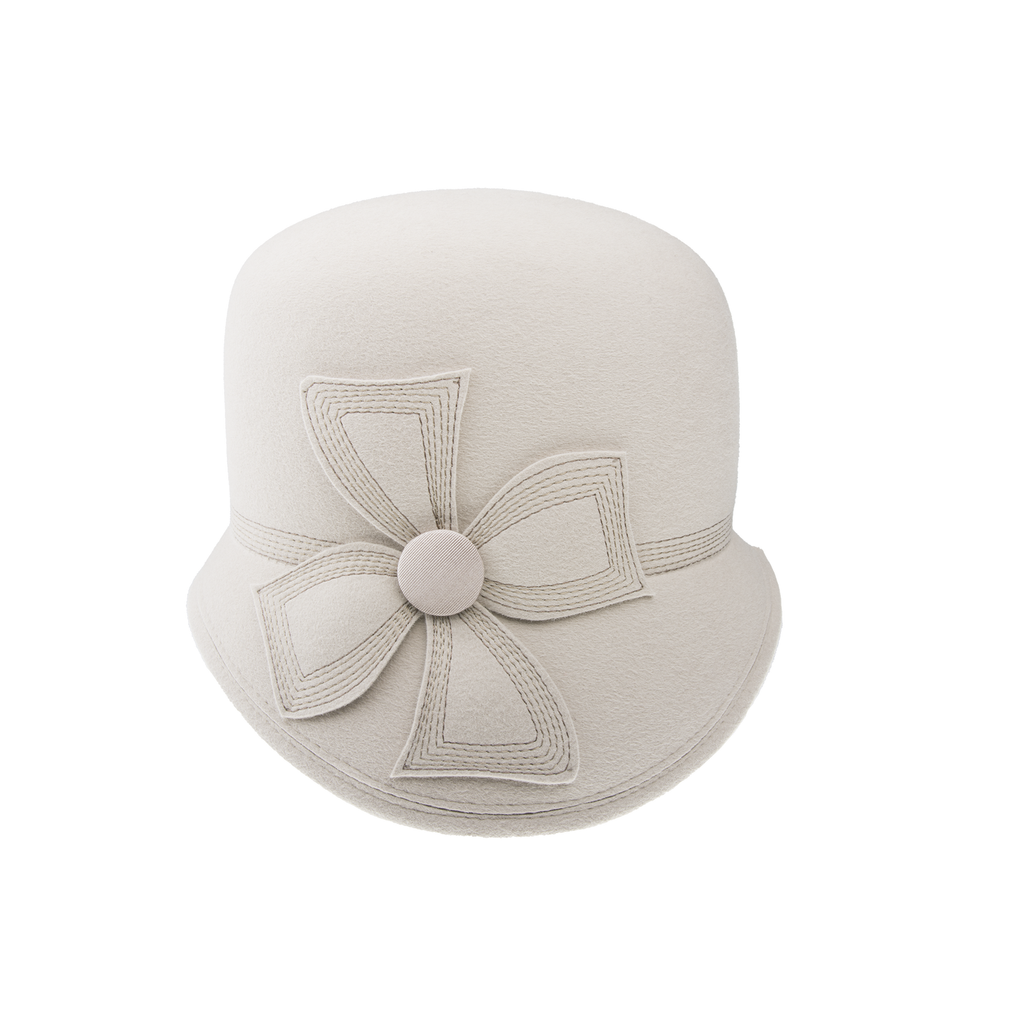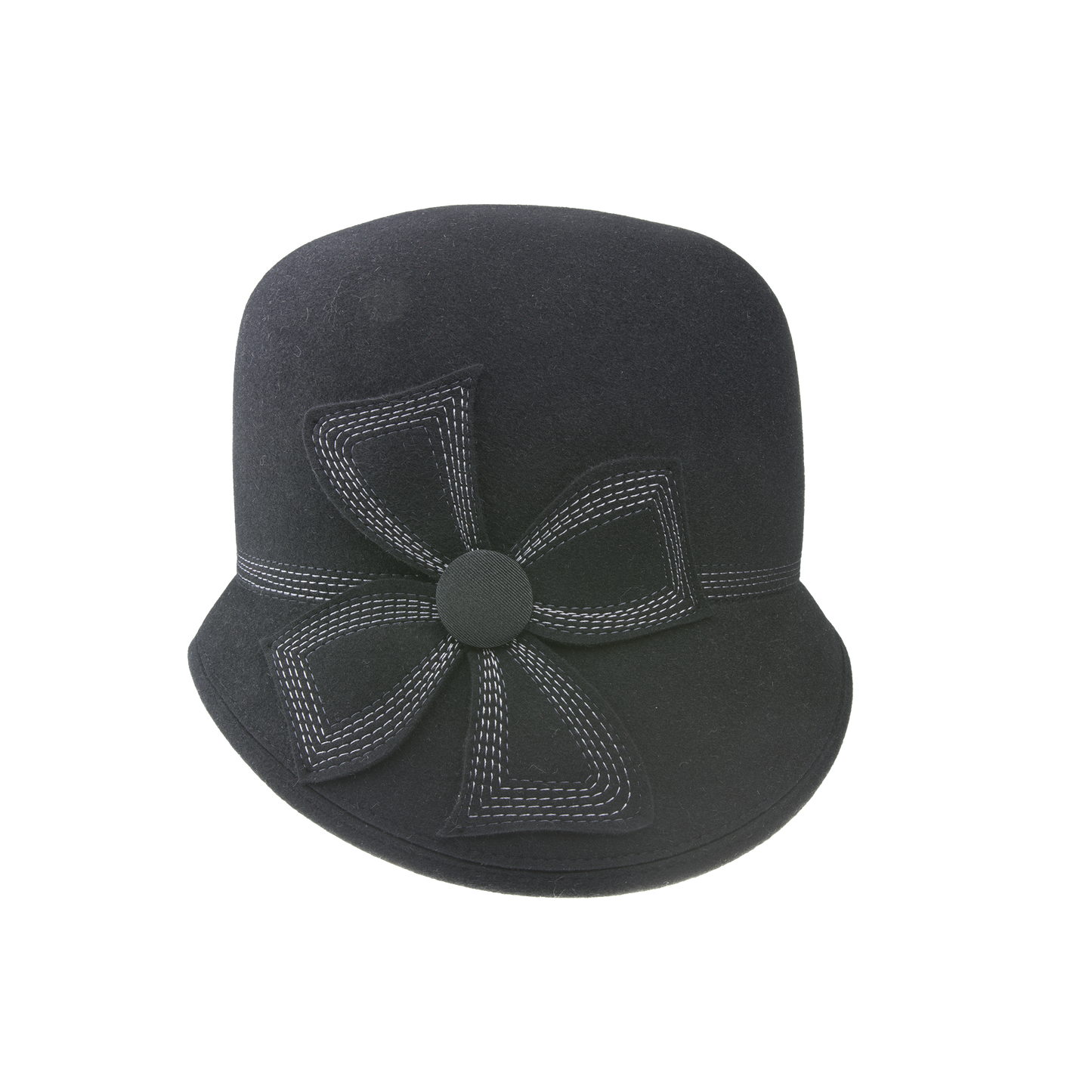 Dámský klobouk zdobený plstěným kvítkem s knoflíkem a prošitím, vybaven pružným potním páskem.