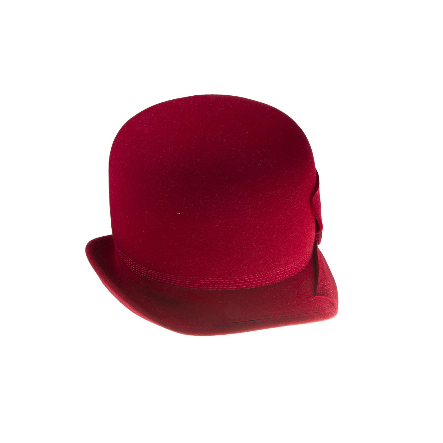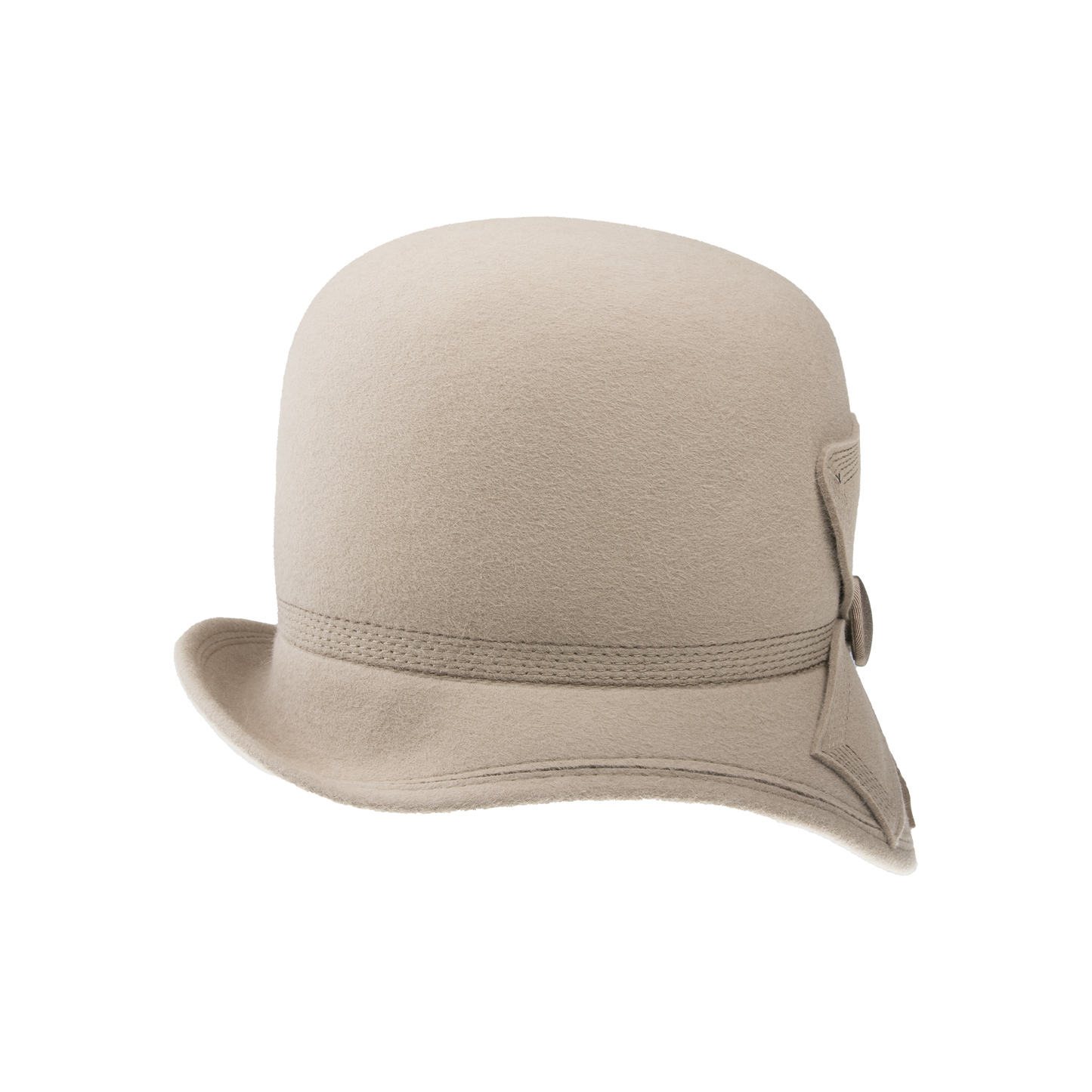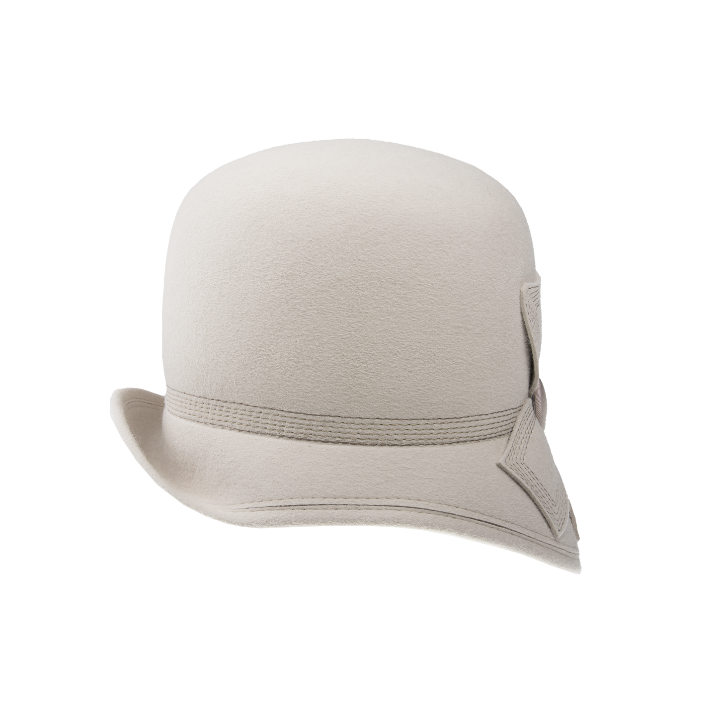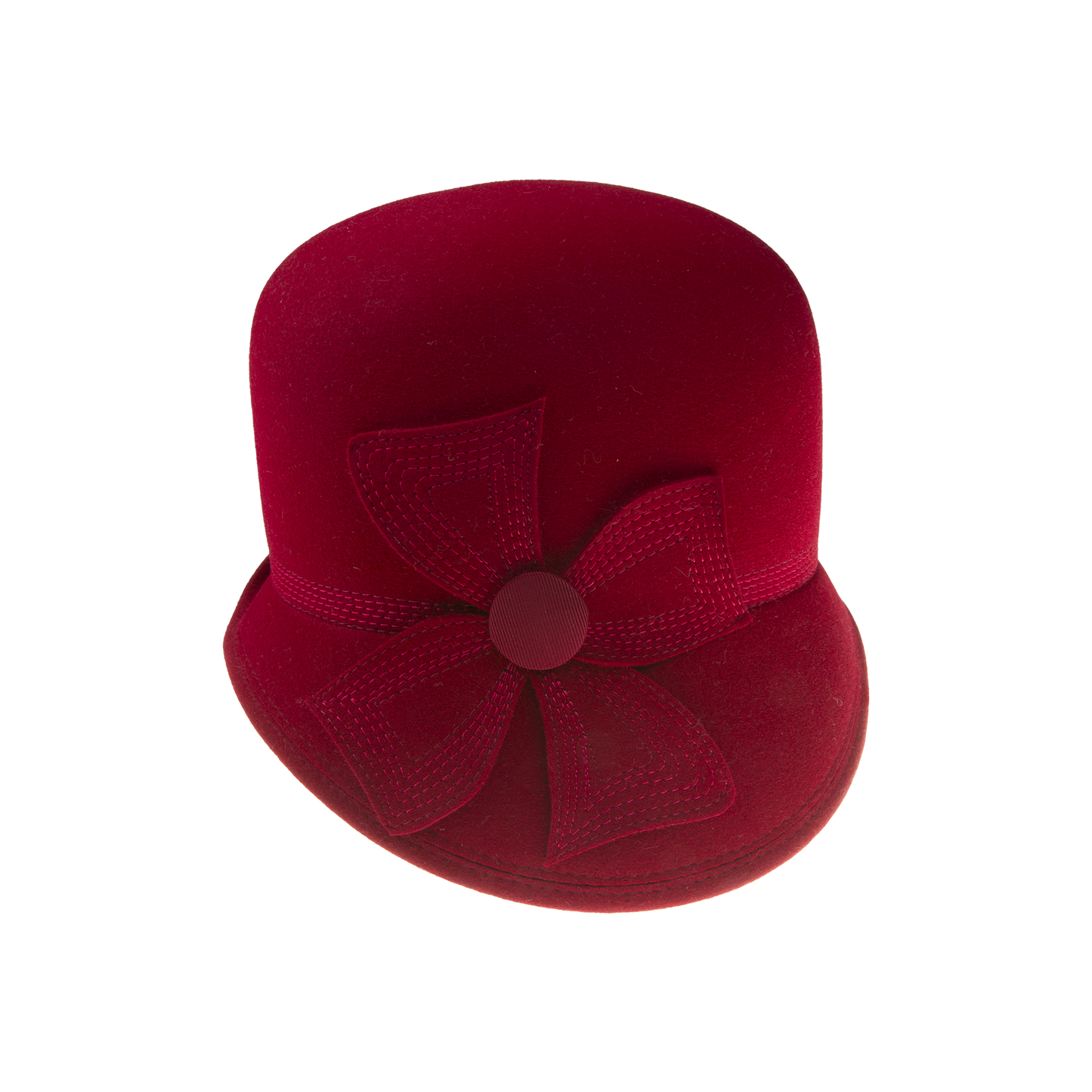 Dámský klobouk zdobený plstěným kvítkem s knoflíkem a prošitím, vybaven pružným potním páskem.