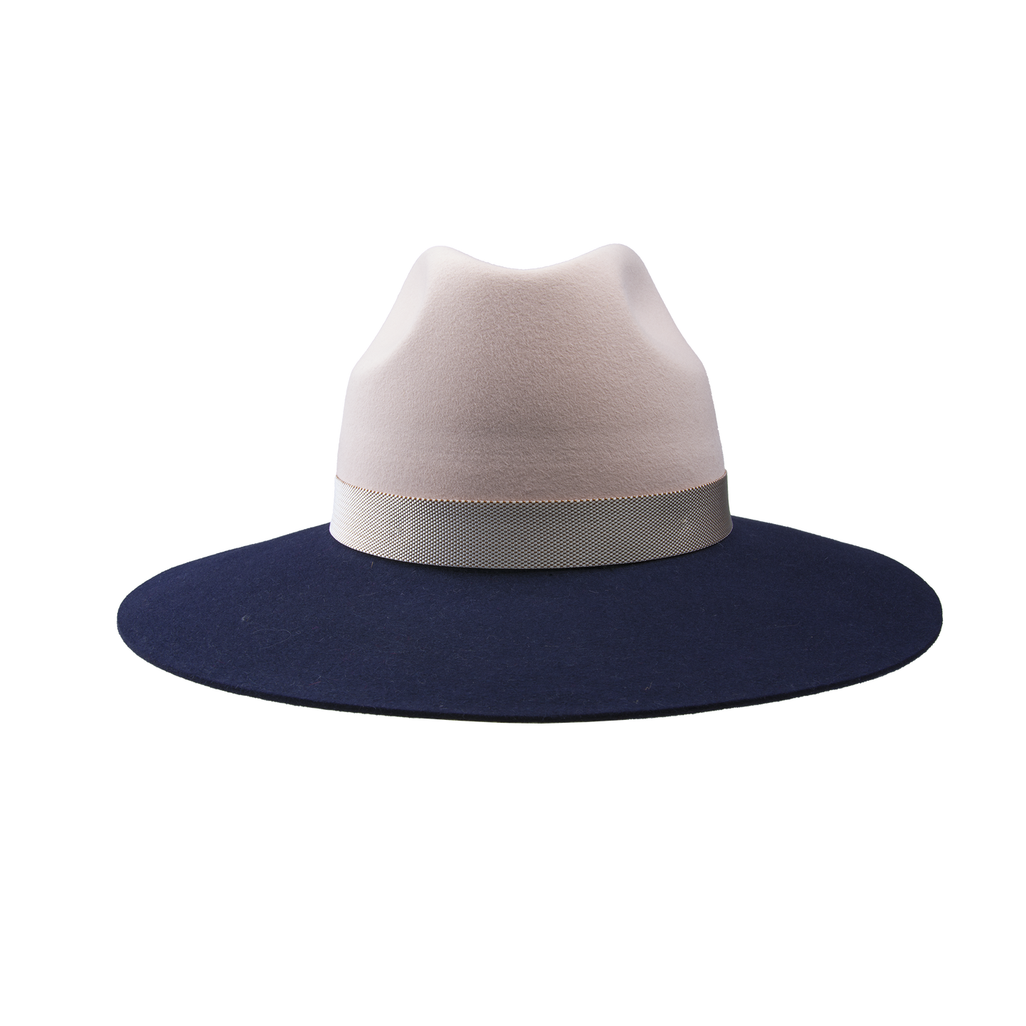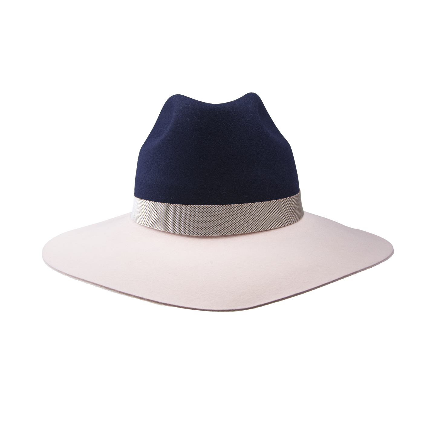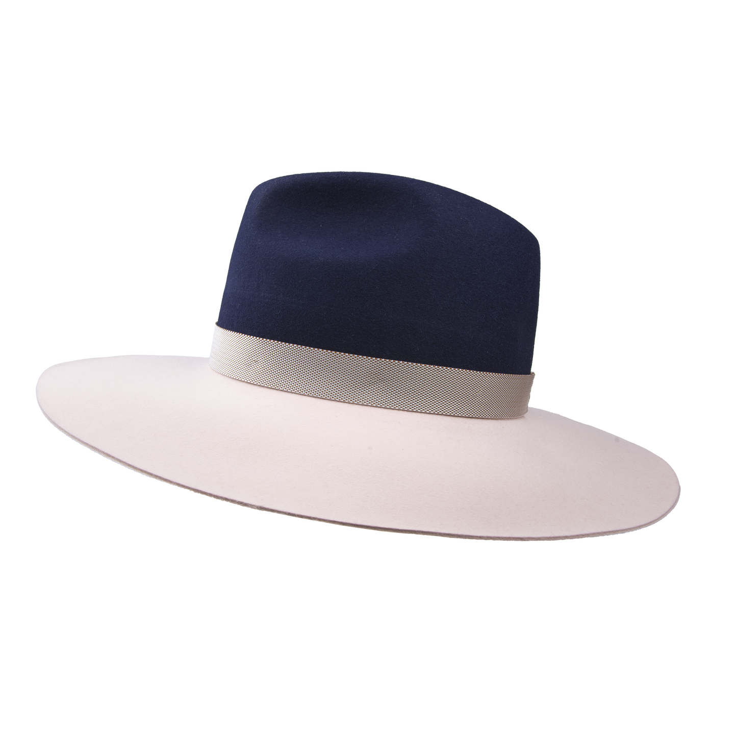 Zámišový klobouk z měkčí plsti s látkovým potním páskem zdobený stuhou. Šířka krempy 9-9,5 cm.