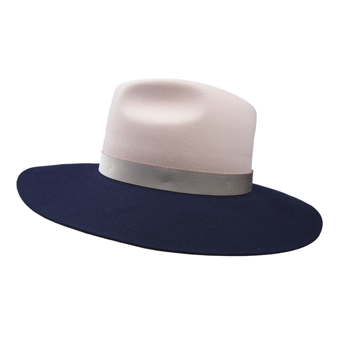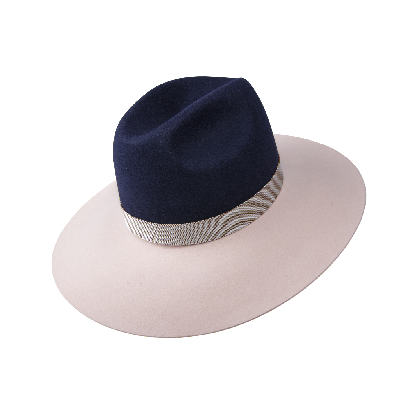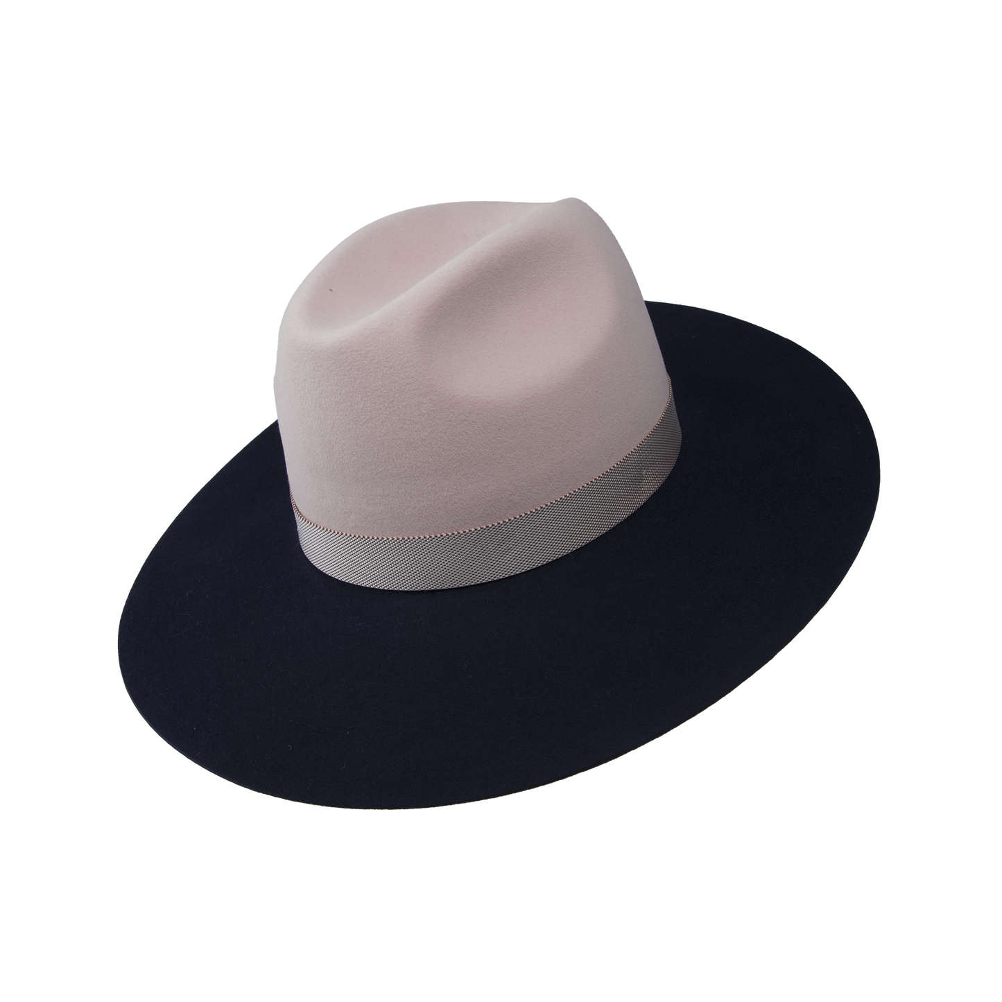 Zámišový klobouk z měkčí plsti s látkovým potním páskem zdobený stuhou. Šířka krempy 9-9,5 cm.
