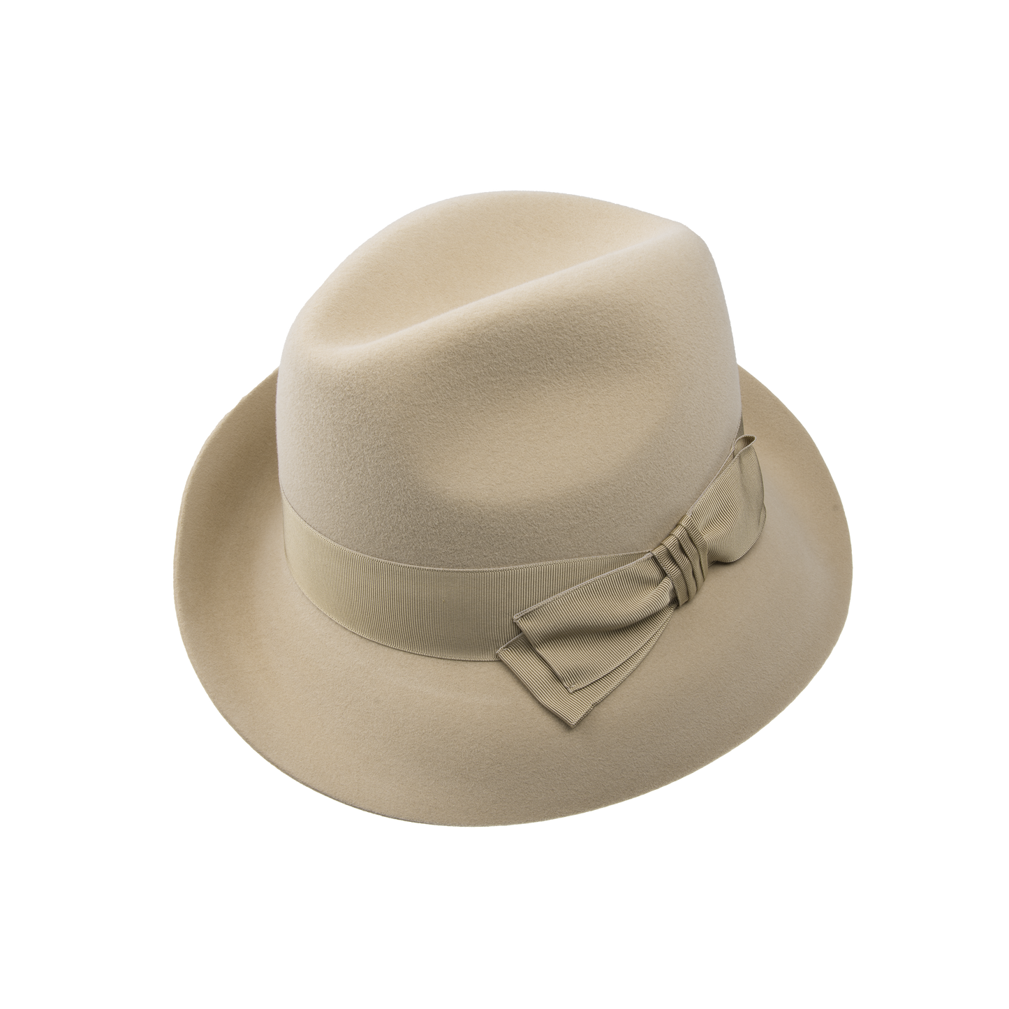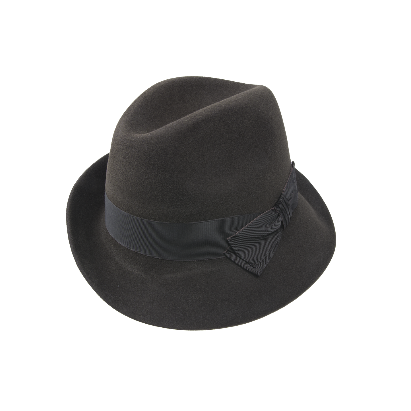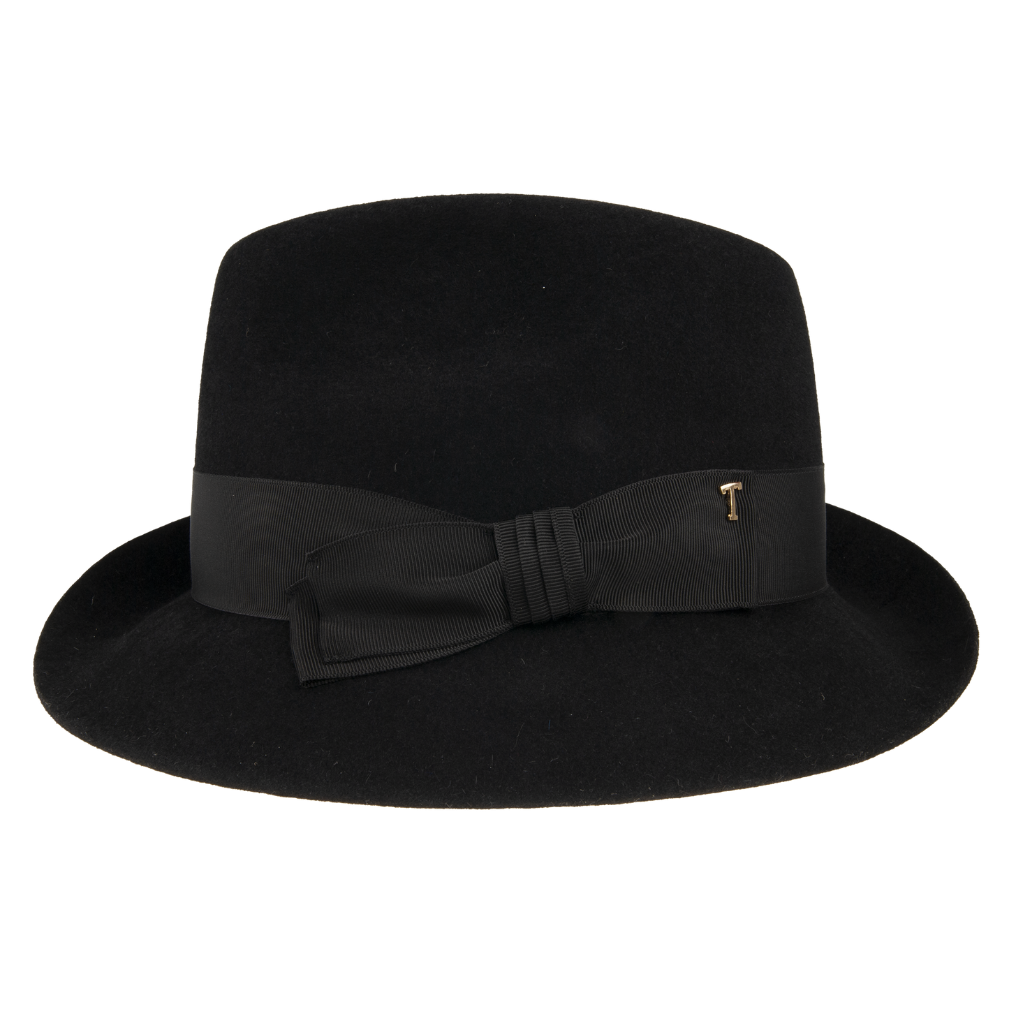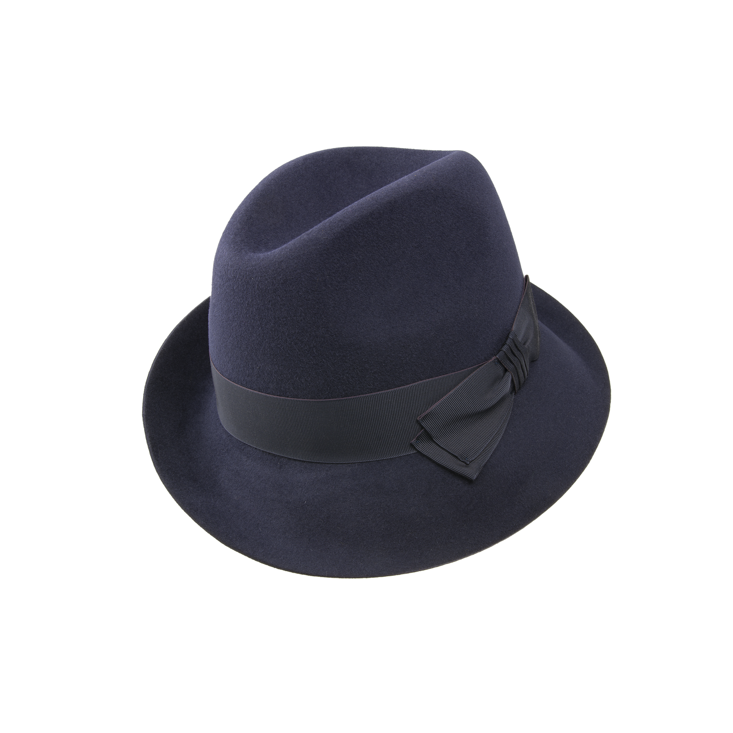 Asymetrický luxusní zámišový klobouk zdobený rypsovou stuhou s mašlí dodá každému outfitu šmrnc. Klobouk doporučujeme nosit s elegantnějšími saky a kabáty.