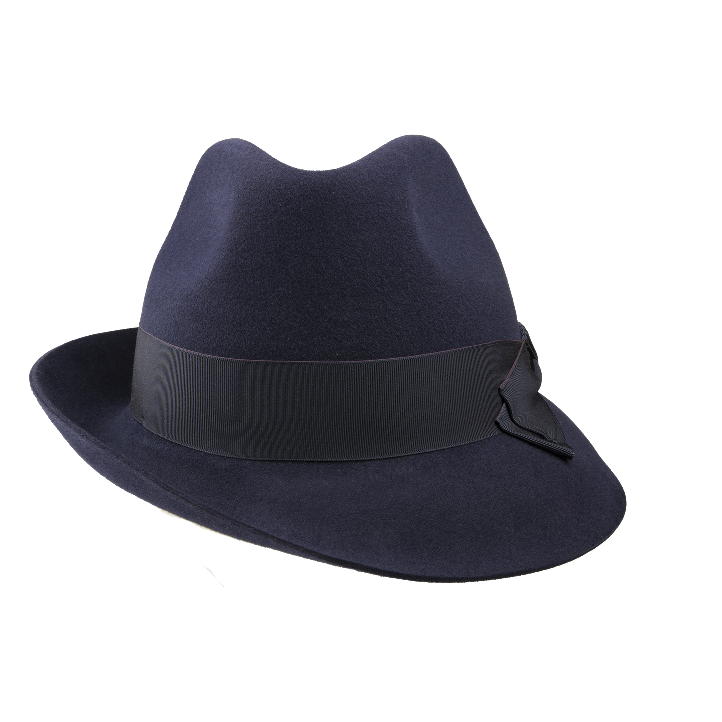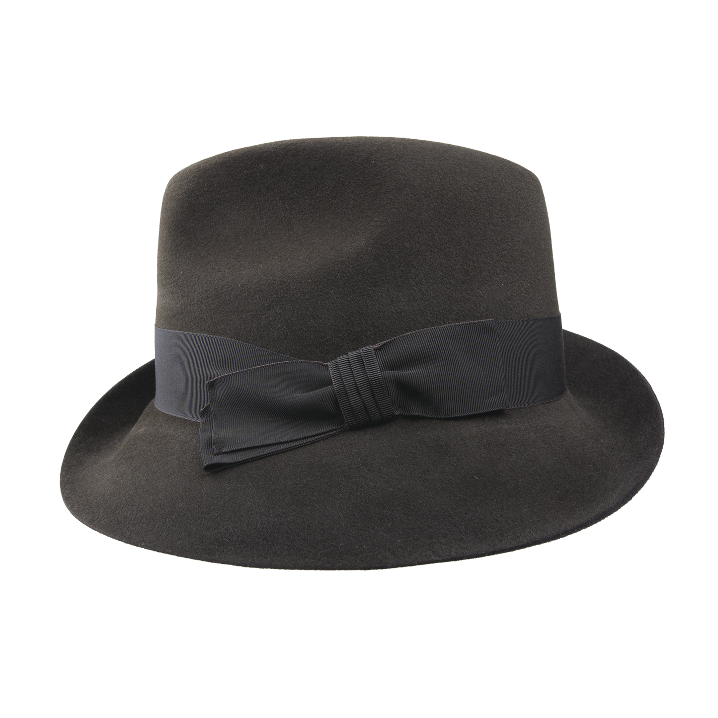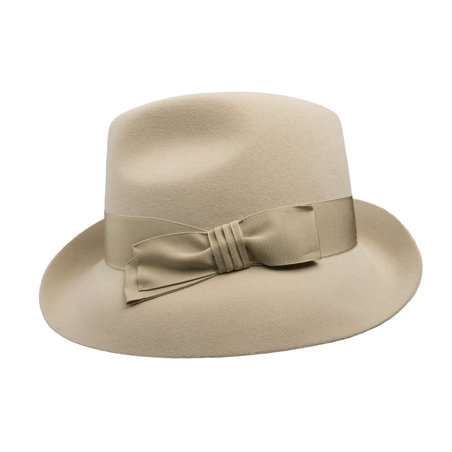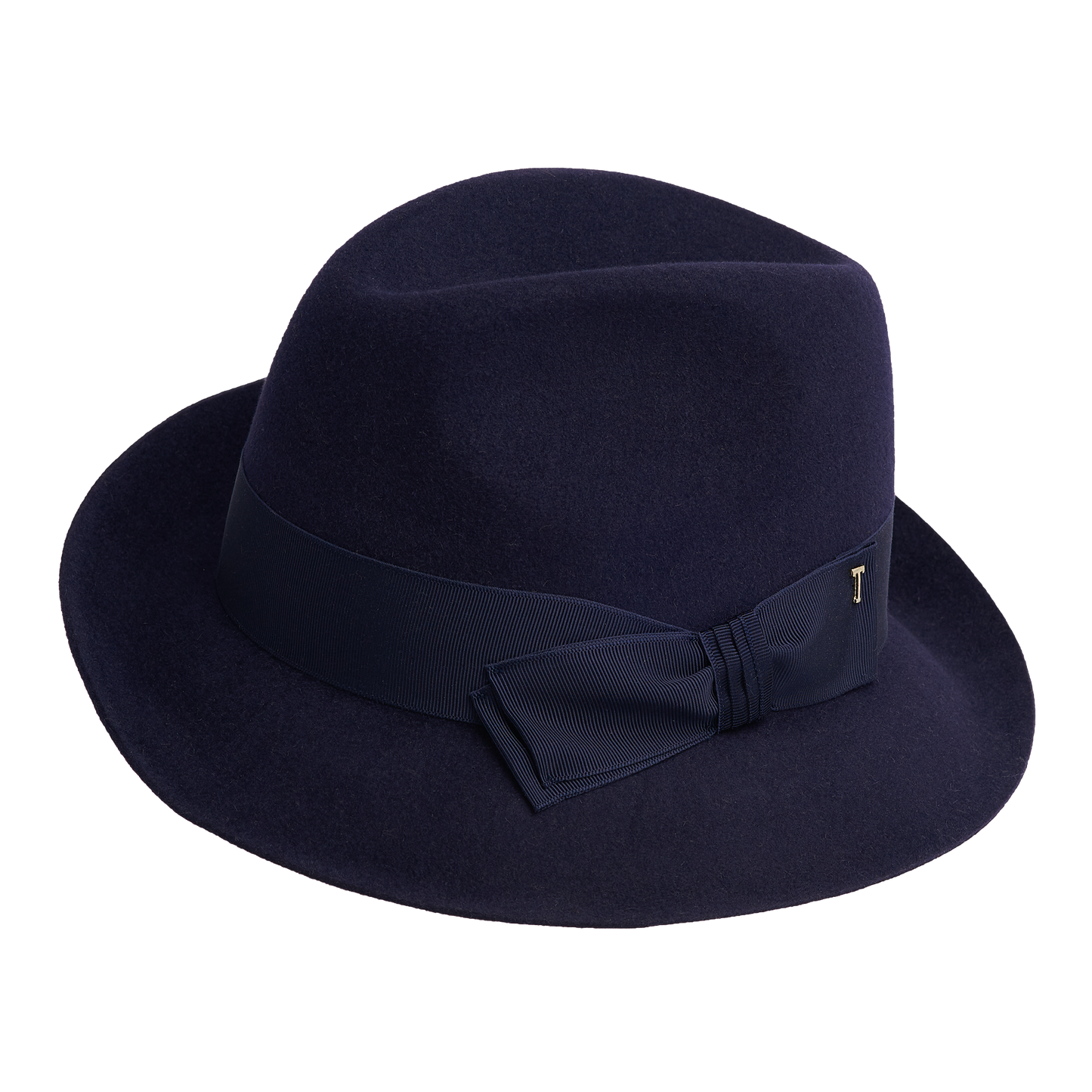 Asymetrický luxusní zámišový klobouk zdobený rypsovou stuhou s mašlí dodá každému outfitu šmrnc. Klobouk doporučujeme nosit s elegantnějšími saky a kabáty.