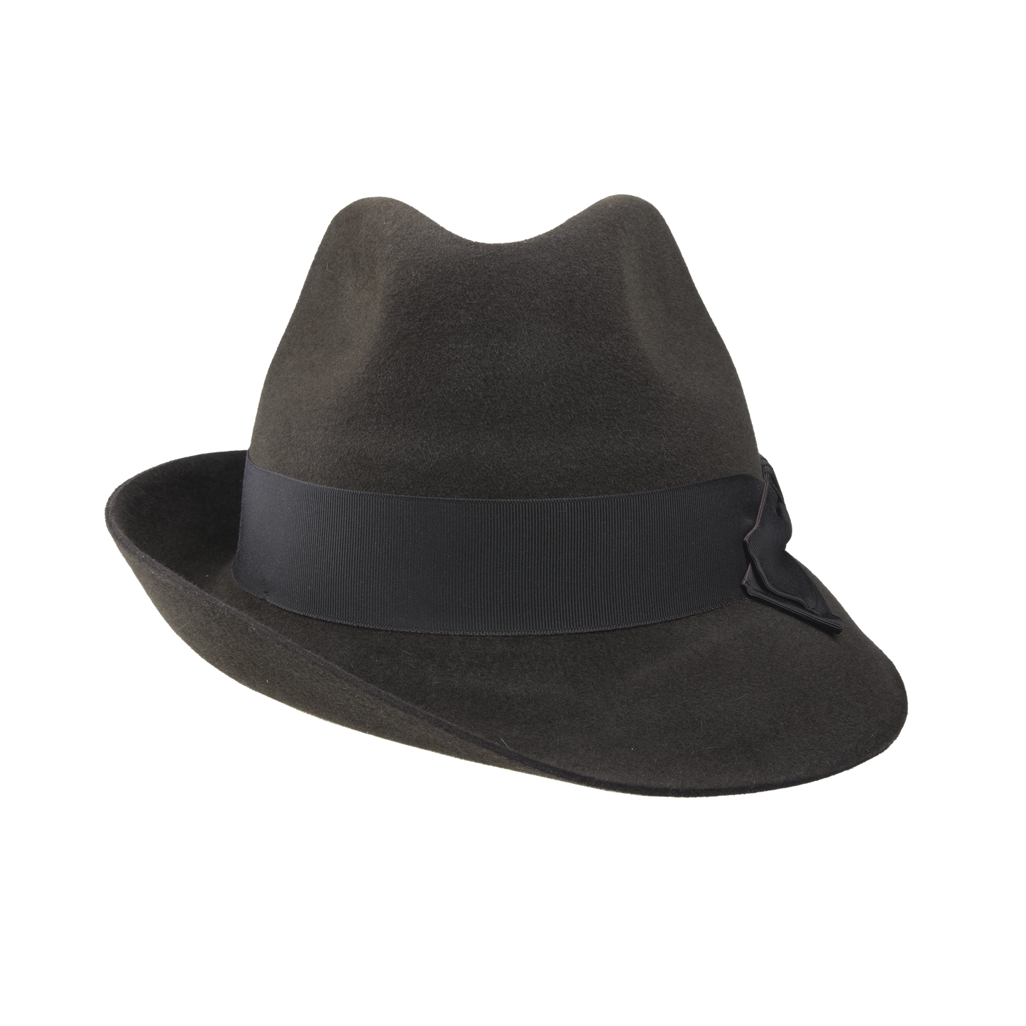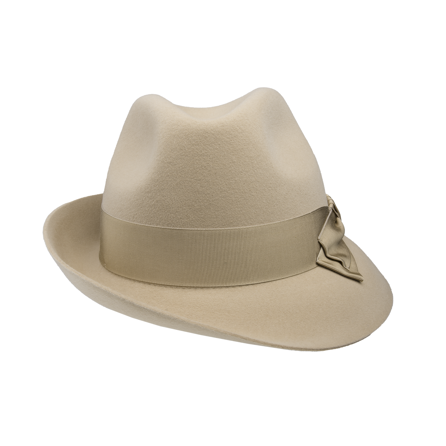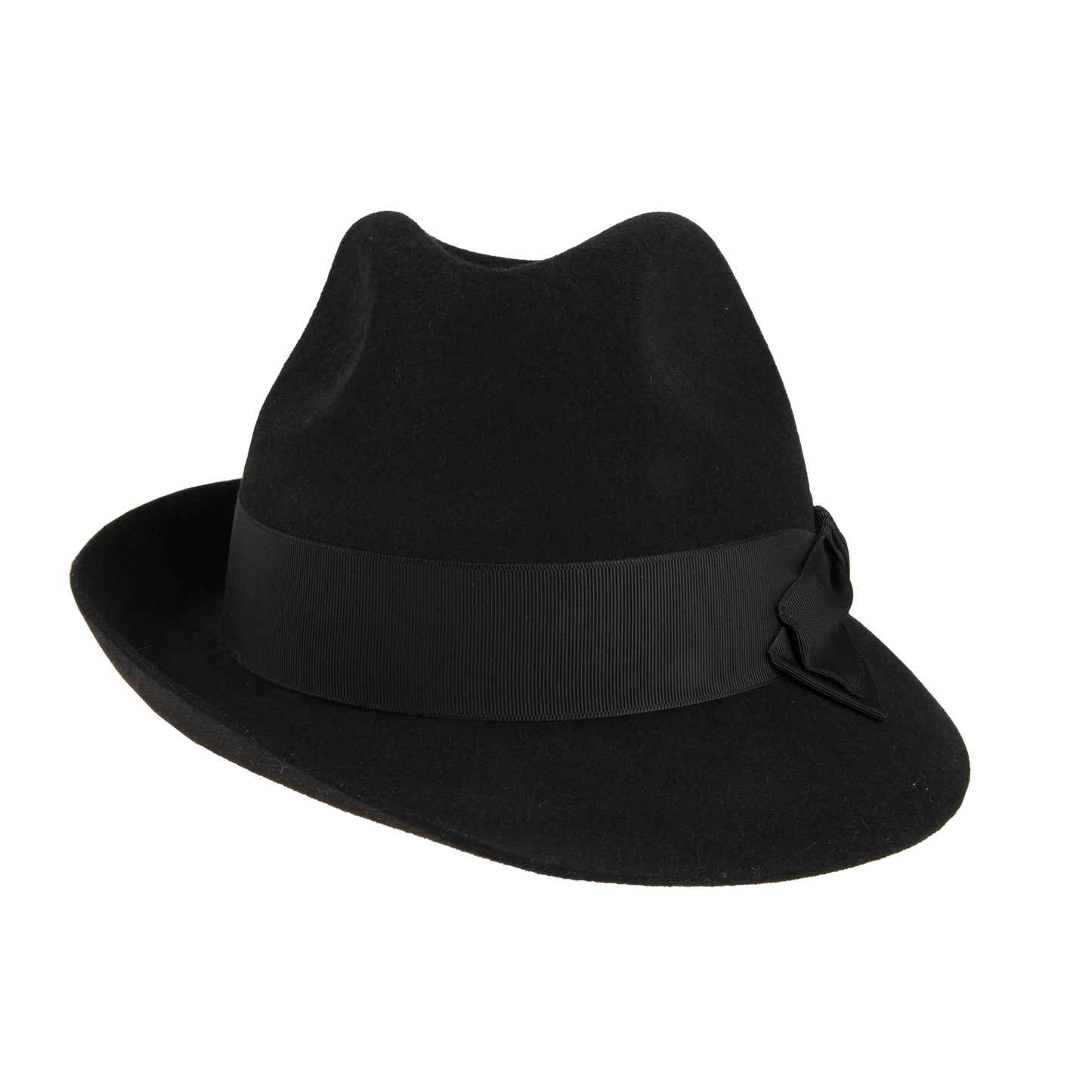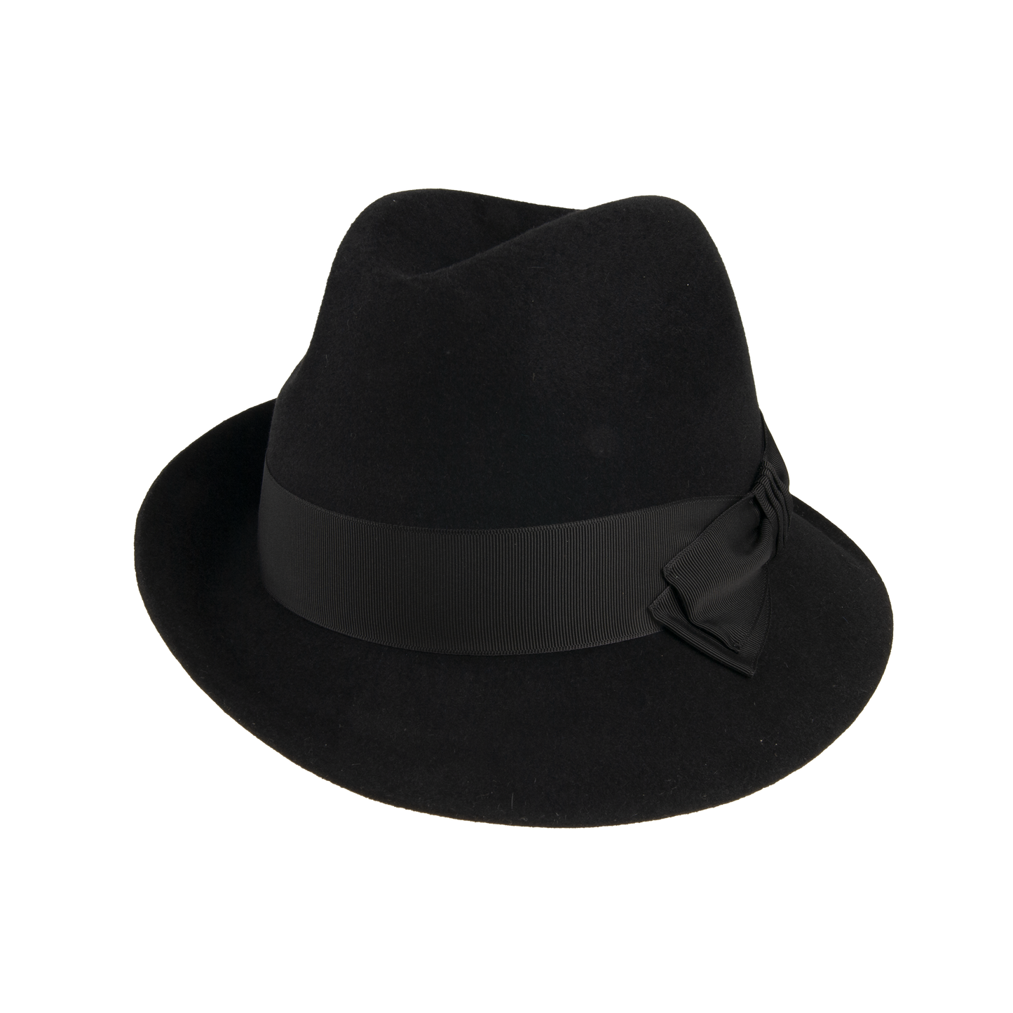 Asymetrický luxusní zámišový klobouk zdobený rypsovou stuhou s mašlí dodá každému outfitu šmrnc. Klobouk doporučujeme nosit s elegantnějšími saky a kabáty.